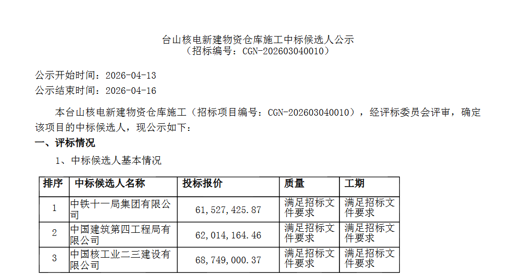 4月13日,台山核电3、4号机组项目配套的新建物资仓库工程发布中标候选人公示。经过角逐,中铁十一局集团有限公司以约6152.7万元的报价成为第一中标候选人,中国建筑第四工程局有限公司(约6201.4万元)与中国核工业二三建设有限公司(约6874.9万元)分列二、三位。该项目建筑面积7865平方米,计划工期540天,是总投资约435亿元的台山核电3、4号机组的重要组成部分。