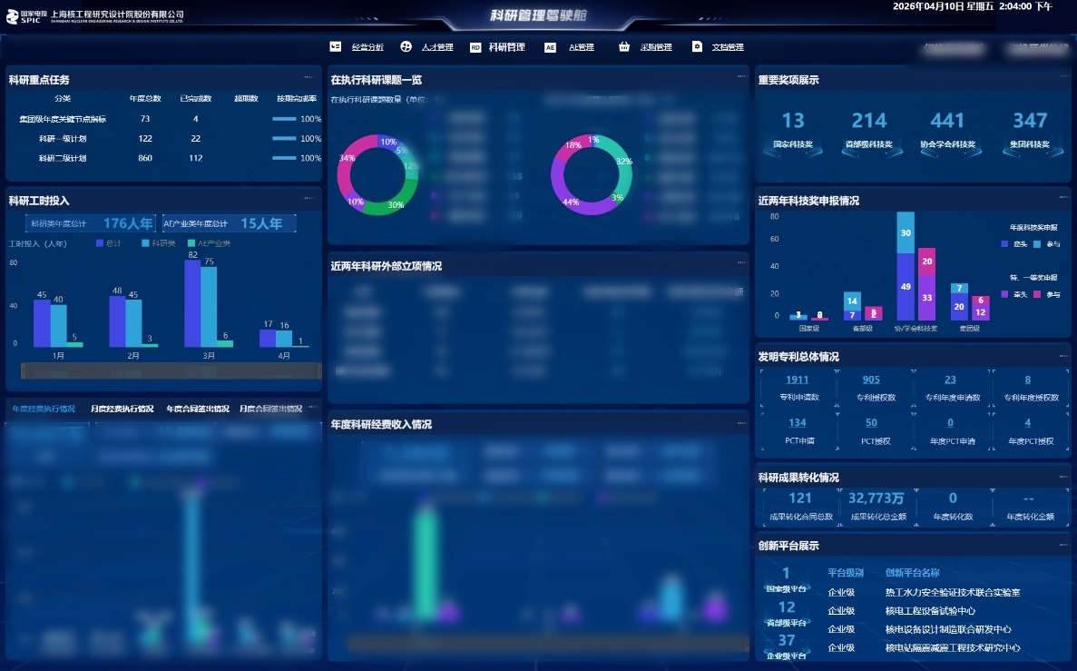 上海核工院构建了“内外融合型创新生态”模型,通过“三协同”“五同步”机制及配套科研管理平台,实现跨部门数据贯通,将科研管理从多人协同单项目转为单人多项目管控模式,显著提升效率、降低出错率。同时进一步融合人工智能技术,开发“智慧问答”工具与科研管理驾驶舱,促进信息高效交互,推动科技创新范式变革。