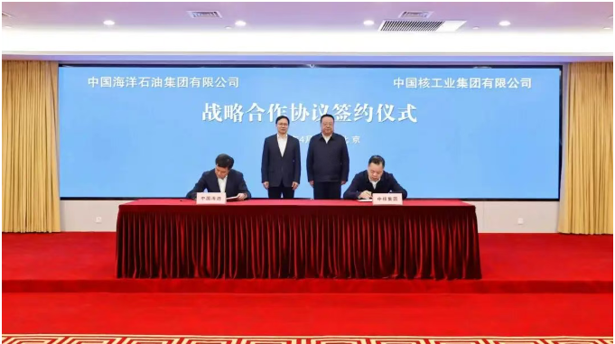 4月15日,中核集团党组书记、董事长申彦锋一行赴中国海洋石油集团有限公司,拜会中国海油党组书记、董事长张传江。双方围绕新能源开发、核电项目合作、科技创新等领域进行深入交流并签署战略合作协议。中国海油党组成员、总会计师穆秀平,中核集团党组成员、总会计师王学军参加会见。
