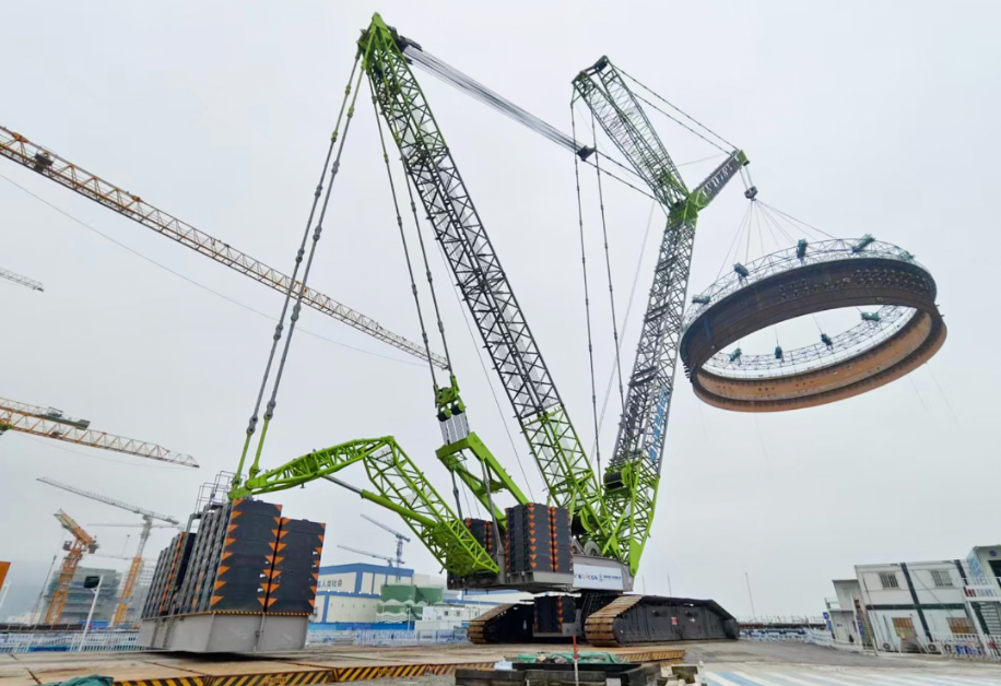2000吨履带吊完成起吊、回转等操作,平稳转运环形吊具,同步开展溜绳控制、吊点对位、索具连接;