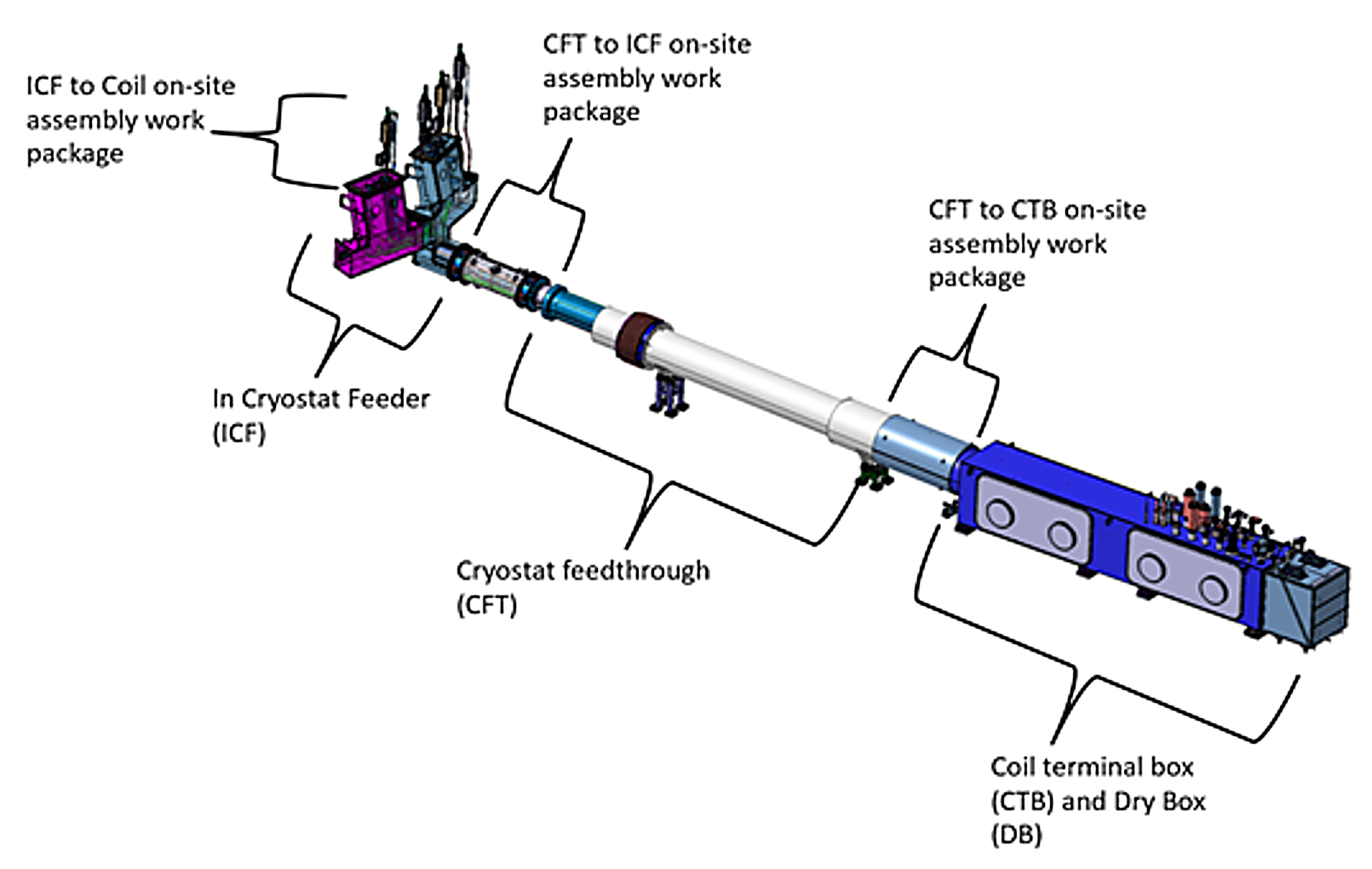 构建磁体馈线所需的三个分段中,有两个(线圈终端盒和过渡馈线)安装在ITER杜瓦容器外部的支架上,内馈线则直接与磁体相连。极向场磁体线圈和中心螺线管磁体的各个模块均由各自的馈线供电,环向场磁体线圈则两两共用一套馈线,18个校正场线圈由5套馈线提供服务。