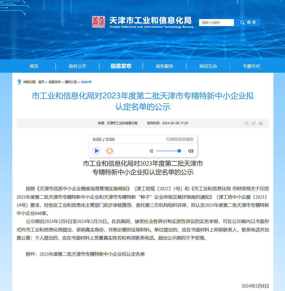 2月8日,天津市工业和信息化局公布了2023年度第二批市专精特新中小企业拟认定名单,中核安科锐(天津)医疗科技有限责任公司荣幸在列,获评“专精特新中小企业”称号。