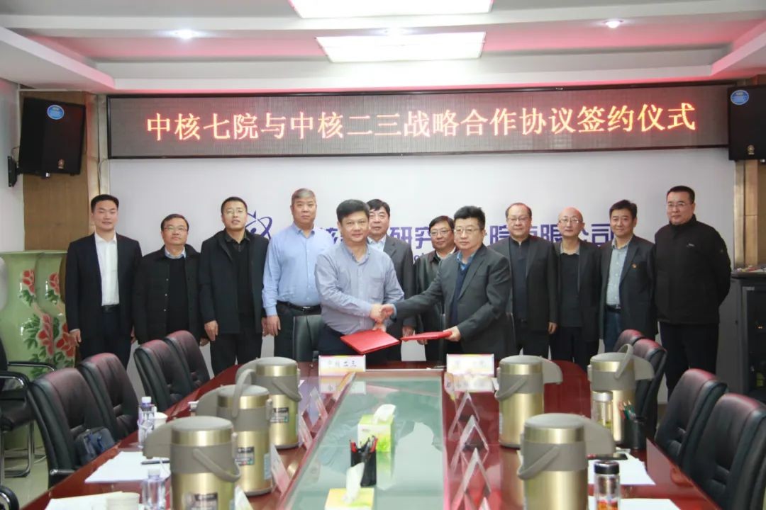 12月8日,中核二三董事长、党委书记李启彬一行拜访中核第七研究设计院有限公司(简称“中核七院”)董事长、党委书记李江颖,双方就进一步深化合作、协同创新、实现共赢发展等方面工作进行了深入交流。交流期间,在李启彬、李江颖的共同见证下,中核七院党委委员、总经理助理李志峰,中核二三副总经济师、系统事业部总经理施发永代表双方签订战略合作协议。
