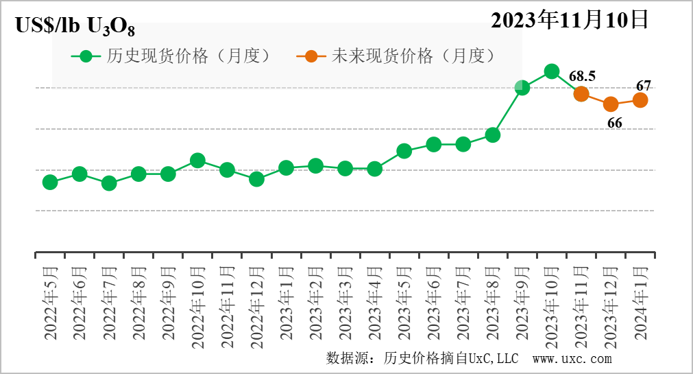 2023年11月10日,中国核能行业协会发布第36期“CNEA国际天然铀价格预测指数(2023年11月)”。