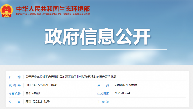 你公司《关于审查巴彦乌拉铀矿床巴润矿段地浸采铀工业性试验环境影响报告表的请示》(中铀发〔2021〕83号)收悉。经研究,批复如下。