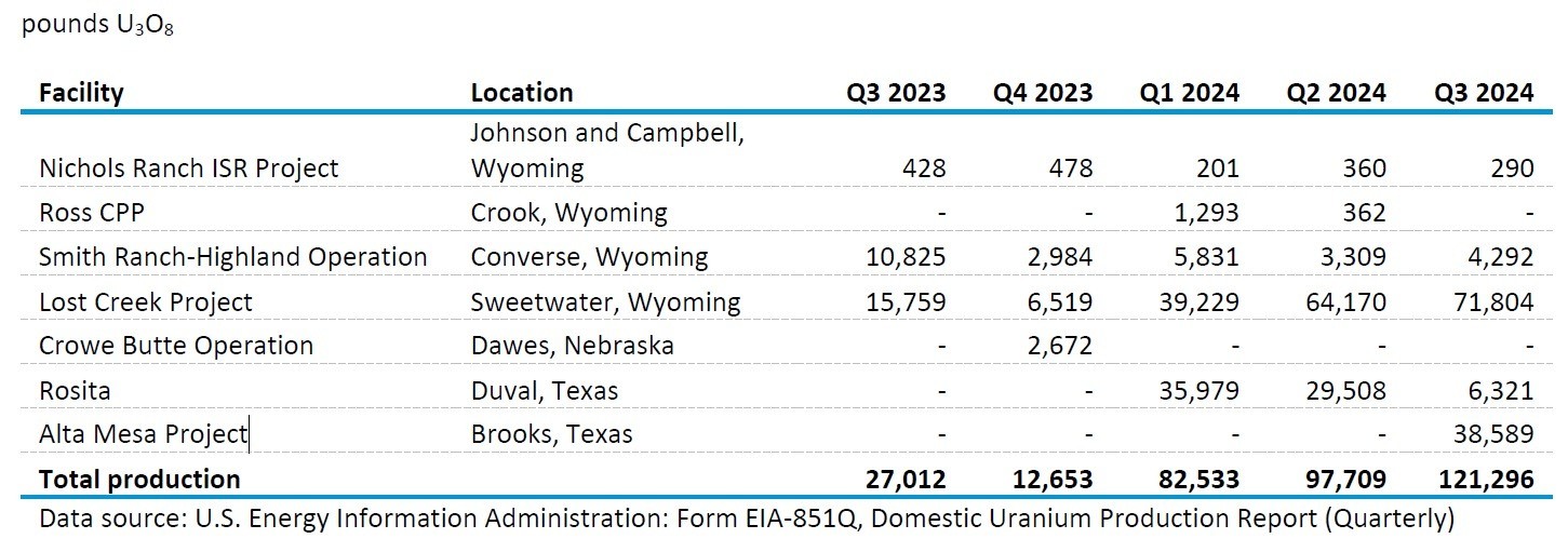 2024年第三季度美国U3O8铀精矿产量达121,296磅(55吨)。