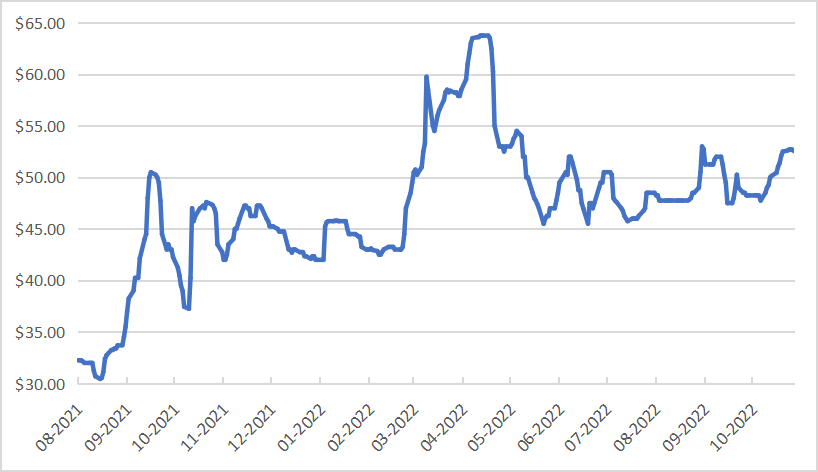 10月市场消化了近100万磅法国Orano转化厂的采购需求。本周市场采购欲望锐减,法国Orano转化厂交易价位从52.85美元/磅高位回落至52.70美元/磅,铀价周五收盘52.55美元/磅。本周美股走势持续强劲,叠加周五美国公布最新经济数据呈现积极信号,道指单日上涨超800点,道指、纳指和标普三大指数均上涨超2%。受美股牵引,天然铀投资基金斯普罗特(SPUT)股价一度升至每股13美元,触发基金进场采购,本周增持20万磅天然铀现货。