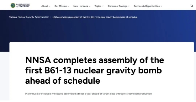 据美国能源部称,新型核弹B61-13的首个生产型号已经完成制造,完成时间比原计划提前了大约一年。B61-13是在之前型号B61-12核弹的基础上开发的,但具有更高的爆炸当量。据称,B61-13的最大当量预计在340至360千吨之间TNT炸药,而作为对比,1945年美军投向日本广岛的原子弹的爆炸当量为15千吨,这意味着B61-13的威力是广岛原子弹的20倍以上。美国官员还声称,B61-13具备重要的额外能力,可以威胁到地下指挥和控制设施以及分布在更大区域的固定目标。美...