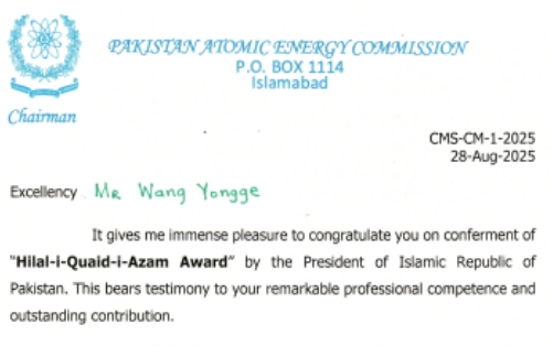 近日,巴基斯坦原子能委员会主席阿里·拉扎致信中国中原董事长王永革,祝贺他荣获巴基斯坦国家荣誉奖章新月勋章,这一荣誉是对其在巴核能合作领域杰出贡献的高度认可。据了解,新月勋章是巴基斯坦极具价值的高级别荣誉之一,其设立与授予承载着巴基斯坦对杰出贡献者的高度认可,获奖者多为在各自领域具备深厚专业素养、取得突破性成果,或对巴基斯坦社会进步、经济发展、国际形象提升产生积极影响的人物。阿里・拉扎在贺信中强调,这一荣誉充分证明...
