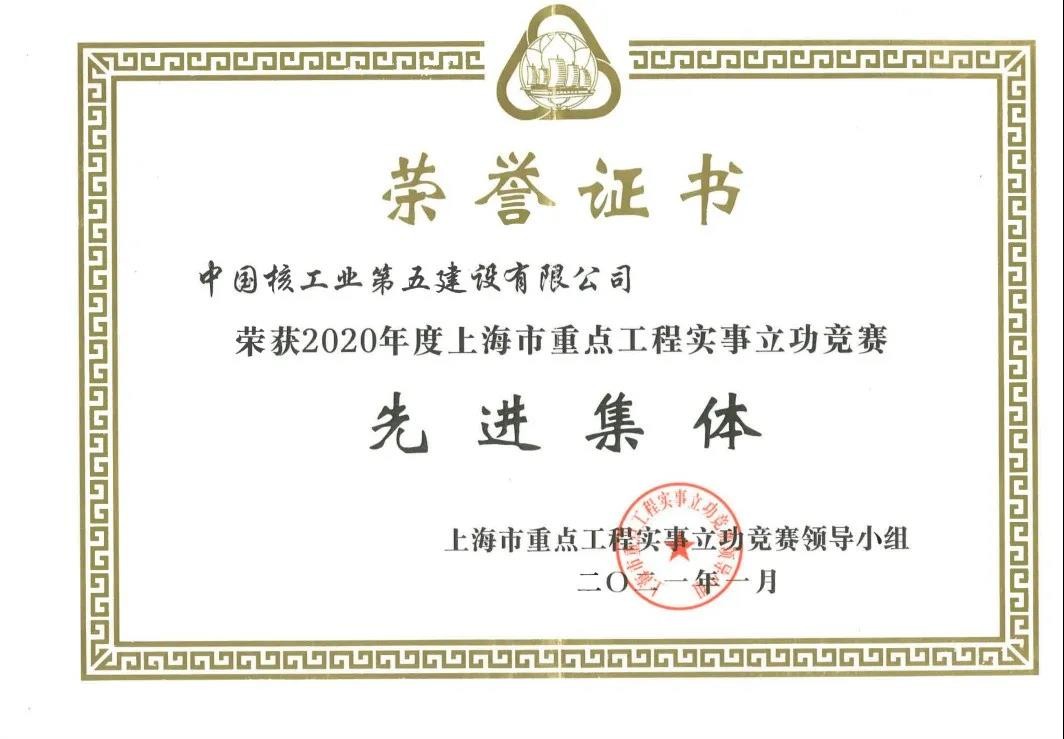 近期,2020年度上海市重点工程实事立功竞赛表彰大会在上海市政府举行。中核五公司荣获2020年度上海市重点工程实事立功竞赛先进集体称号,至此,公司已荣获此项荣誉30次。