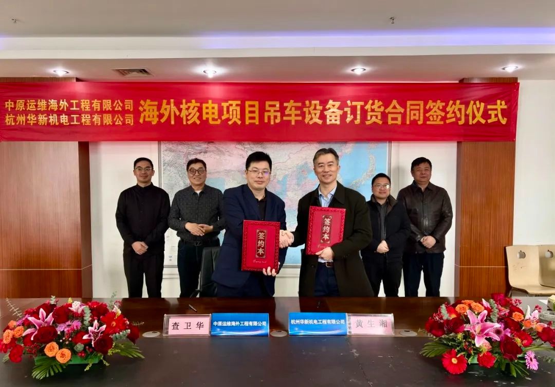 1月11日,中原运维海外工程有限公司和杭州华新机电工程有限公司在海盐生产基地举行海外核电项目吊车设备订货合同签约仪式。