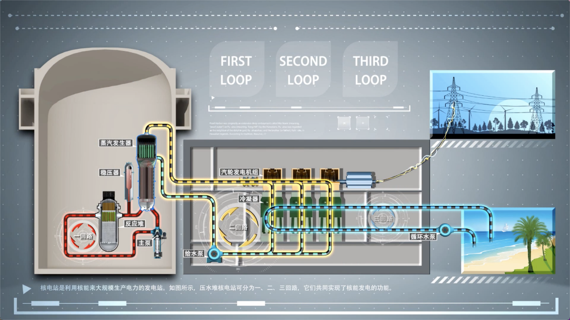 目前我国已投运的核能商用供热项目均采用抽汽供热技术,就是从核电厂汽轮机抽取部分发过电的蒸汽作为热源,将热量送给热力公司再经市政供热网络传递给终端用户。以我国首个核能供热商用示范工程——“暖核一号”海阳核能供热工程为例,这个过程是由五个回路完成的: