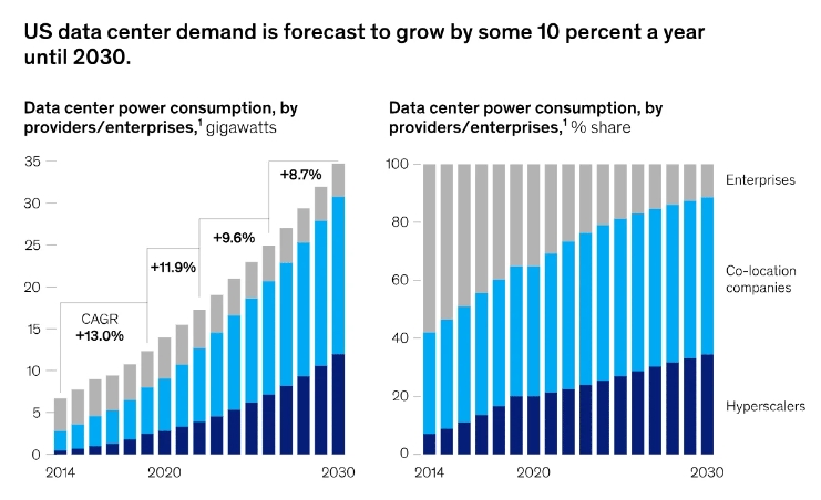 美国数据中心功耗将大幅飙升,从 2022 年的 17 吉瓦 (GW) 增加到 2030 年的 35 吉瓦。这种增长部分归结于越来越多地使用更高功率的芯片来满足要求较高的工作负载,在生成式人工智能淘金热中,市场专家强调,电力才是AI该行业最大的挑战。包括亚马逊、微软、Meta和Alphabet,都在持续扩大其数据中心业务。核电是理想的选择,它安全、高效、能可持续地满足数据中心的庞大能源需求。Constellation Energy 首席执行官 Joseph Dominguez 表示:公司正...