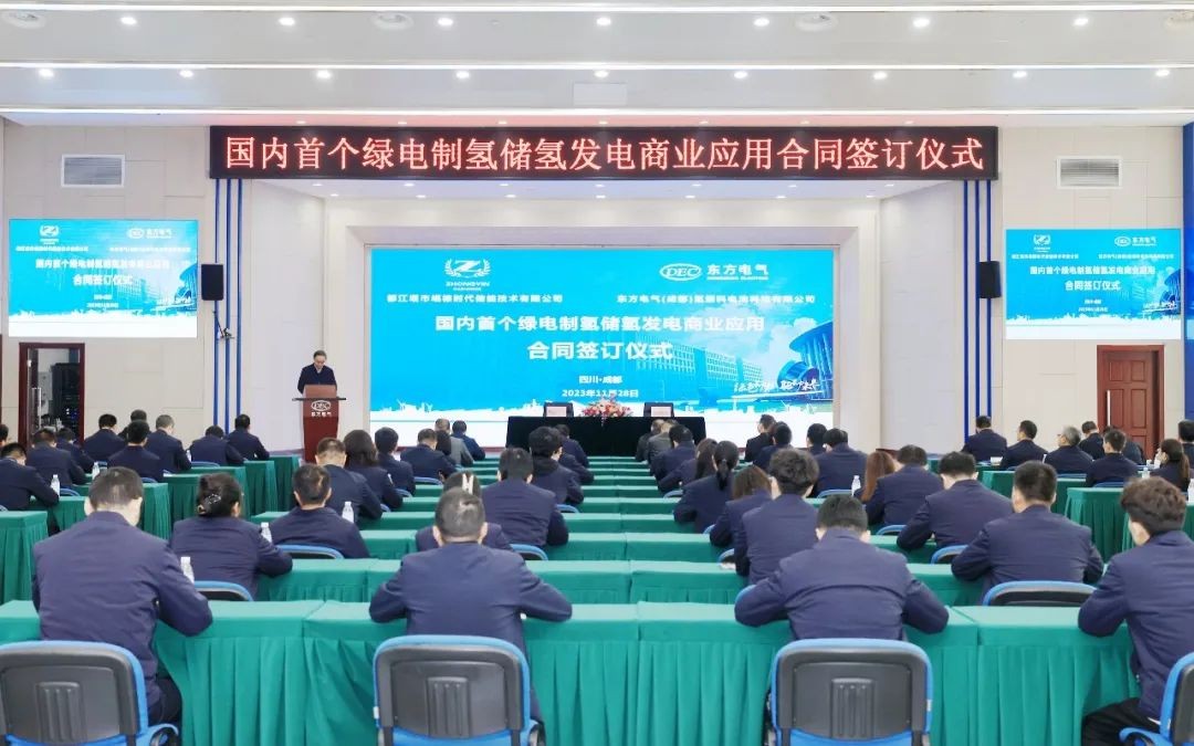 11月28日,国内首个且容量功率最大的绿电制氢储氢发电商业应用项目签约仪式在东方电气集团旗下东方锅炉举行。