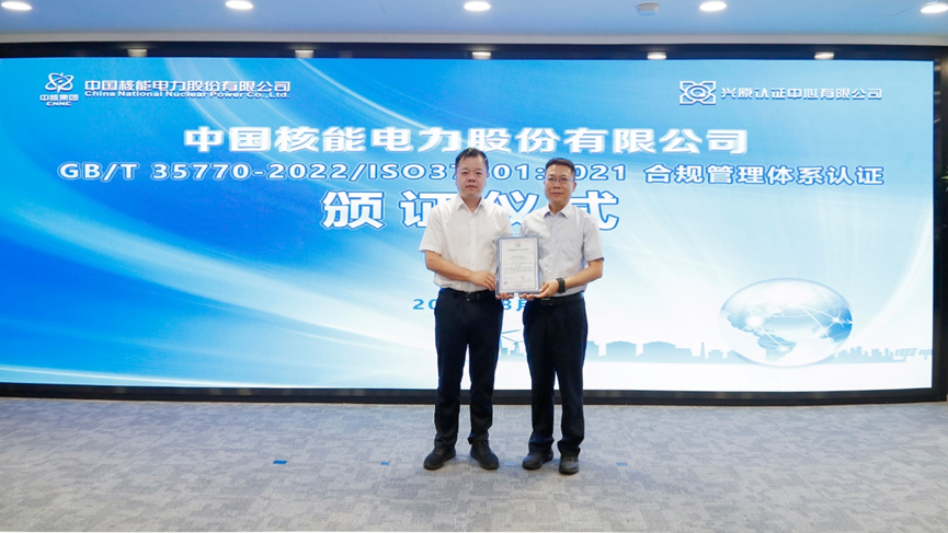 8月24日,中国核电合规管理体系认证证书颁发仪式在京举行。中国核电党委书记、董事长卢铁忠出席活动并讲话,中国核电总会计师、首席合规官刘焕冰主持颁发仪式。