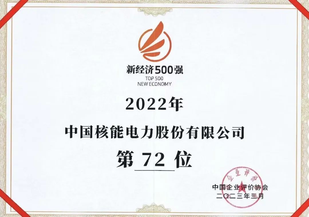 近日,从中国企业评价协会主办的2022中国新经济企业500强发布会上传来喜讯,中国核电获评2022中国新经济企业500强并名列第72名,同时在分榜单“新型能源活动”中排名第4。