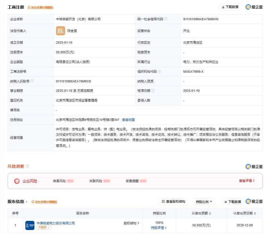 近日,中核核能开发(北京)有限公司成立,法定代表人为陈金星,注册资本为5亿元,经营范围包含:发电业务、输电业务、供(配)电业务;项目策划与公关服务;信息咨询服务等