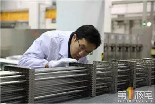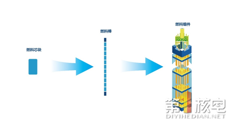燃料元件制造,首先将铀浓缩产生的铀-235含量为3%-5%的六氟化铀气体,转化为二氧化铀固体粉末,再将其压制成芯块并通过高温烧结获得芯块陶瓷体,然后将陶瓷芯块抛光后装入包壳制成燃料棒(燃料元件),最后将燃料棒组装成燃料组件。