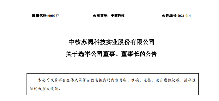 中核苏阀科技实业股份有限公司公告显示,总经理马瀛辞去总经理职务,担任公司董事长职务。同时,董事会聘任龙云飞为公司副总经理,拟选举龙云飞为第八届董事会董事候选人。