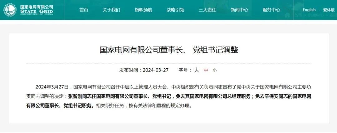 据国家电网官网消息,国家电网有限公司董事长、党组书记调整。