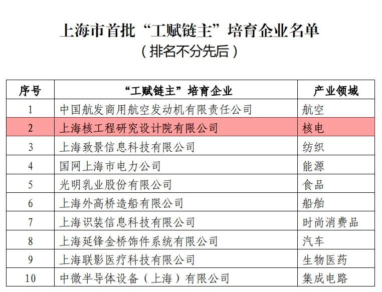 经相关程序确定,于7月25日公布《上海市首批“工赋链主”培育企业名单》,上海核工程研究设计院有限公司入选为核电产业领域“工赋链主”培育企业。