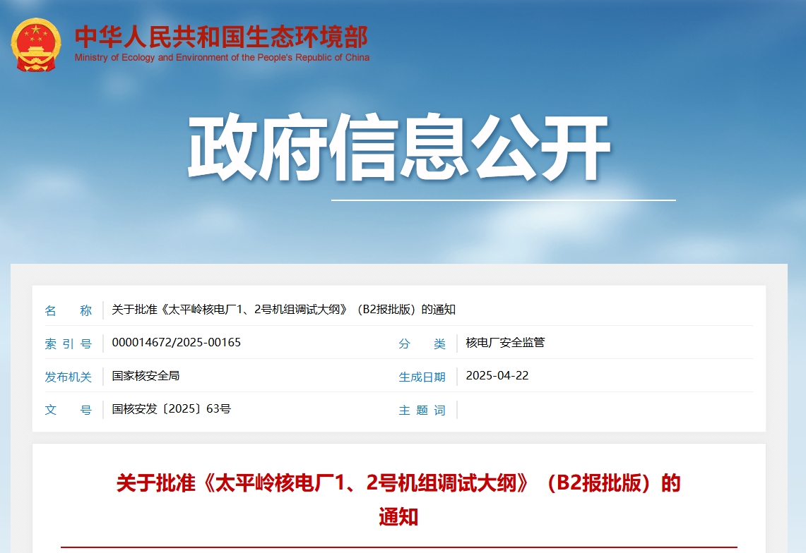 关于批准《太平岭核电厂1、2号机组调试大纲》(B2报批版)的通知
