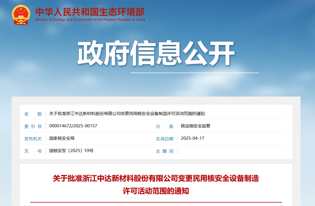 关于批准浙江中达新材料股份有限公司变更民用核安全设备制造许可活动范围的通知