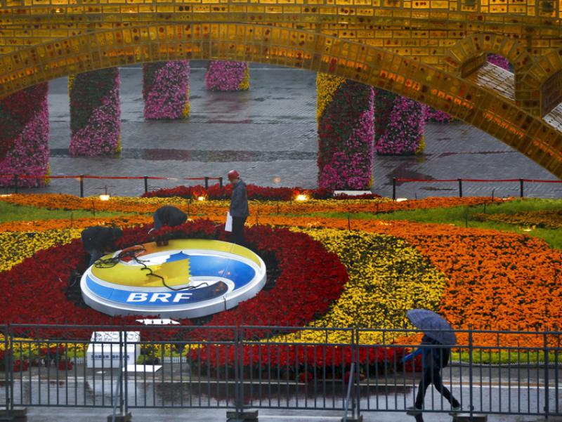 中国国家主席习近平在北京主持的一带一路论坛圆桌会议上,工人们拆除了媒体中心外“丝绸之路金桥”结构旁边的“一带一路”论坛标志, 2019.