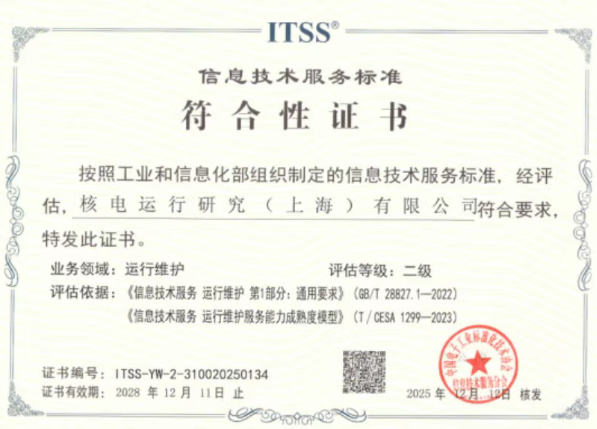 核电运行研究院通过信息技术运维服务成熟度二级认证
