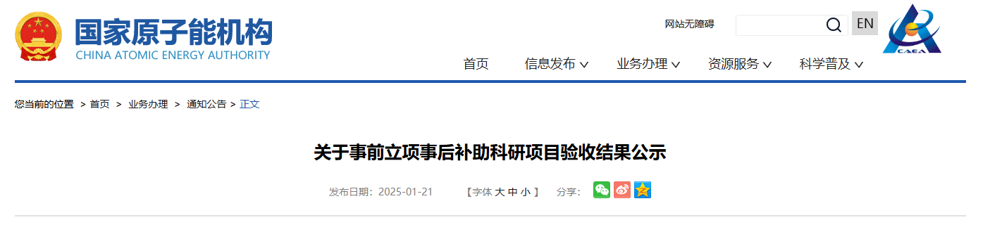 国家原子能机构公示核技术研发后补助科研项目验收结果