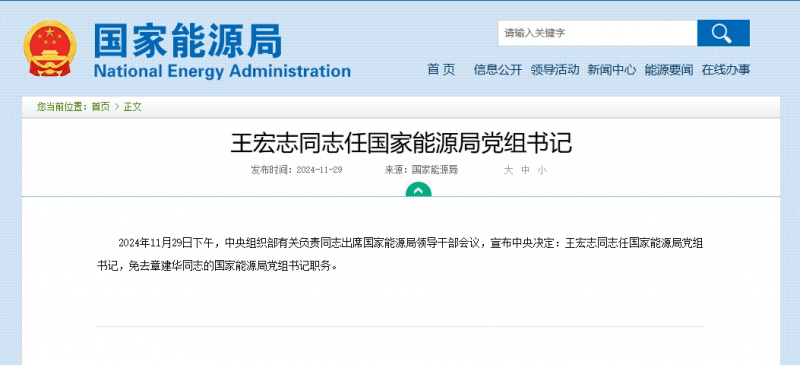 2024年11月29日下午,中央组织部有关负责同志出席国家能源局领导干部会议,宣布中央决定:王宏志同志任国家能源局党组书记,免去章建华同志的国家能源局党组书记职务。