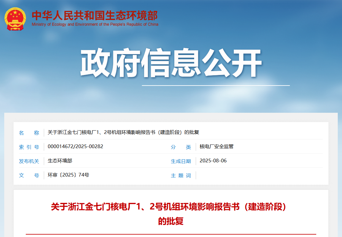 关于浙江金七门核电厂1、2号机组环境影响报告书(建造阶段)的批复中核浙能能源有限公司:你公司《关于恳请审查〈浙江金七门核电厂1、2号机组环境影响报告书(建造阶段)〉的请示》(中核浙能核安发〔2024〕44号)收悉。经研究,批复如下。一、浙江金七门核电厂1、2号机组位于浙江省宁波市象山县鹤浦镇,规划建设两台百万千瓦级压水堆华龙一号核电机组及配套设施。《浙江金七门核电厂1、2号机组环境影响报告书(建造阶段)》编制依据充分,采用的评...