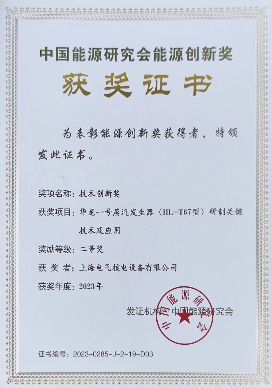 近日,2023年度中国能源研究会能源创新奖正式发布,上海电气核电设备有限公司(以下简称“上核公司”)与中广核工程有限公司(以下简称“中广核工程”)联合攻关的“‘华龙一号’蒸汽发生器(HL-T67型)研制关键技术及应用”项目荣获中国能源研究会能源创新奖技术创新奖二等奖。