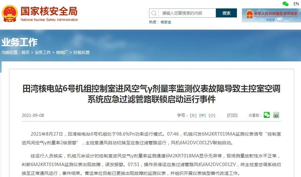 近日,国家核安全局发布了田湾核电站5号机组运行事件情况说明。