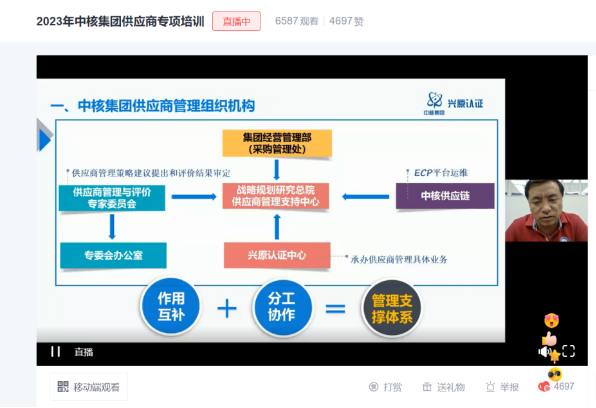 为贯彻落实集团公司加强供应链管理有关要求,进一步推进供应链稳固创新发展,切实做好供应商管理服务与支持工作,中核战略规划研究总院(以下简称“总院”)供应商管理支持中心(以下简称“支持中心”)于2023年9月21日成功举办2023年中核集团供应商专项培训。全国各地2千余家供应商共聚云端,培训直播访问量高达1.3万余次。