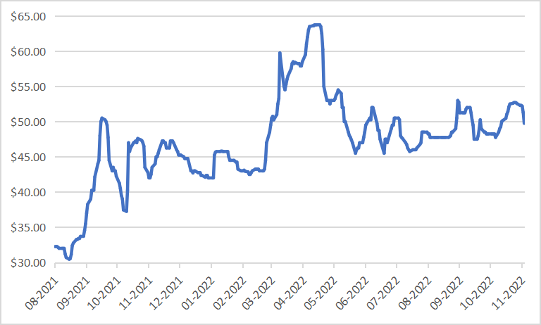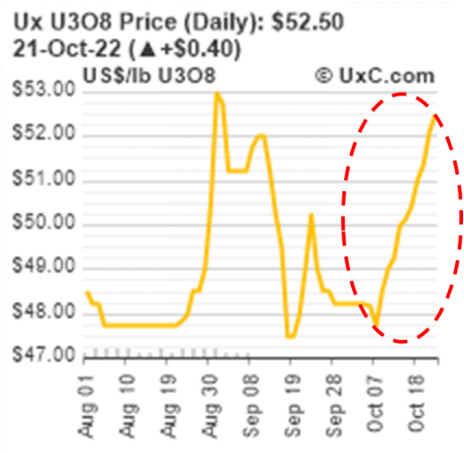 过去两周,天然铀价格出现了一波非典型上涨,从48美元/磅迅速上涨到52美元/磅以上,周五晚上成交了几单的价位为:Orano转化厂52.75美元/磅;Converdyn转化厂52.5美元/磅;Cameco转化厂52美元/磅。