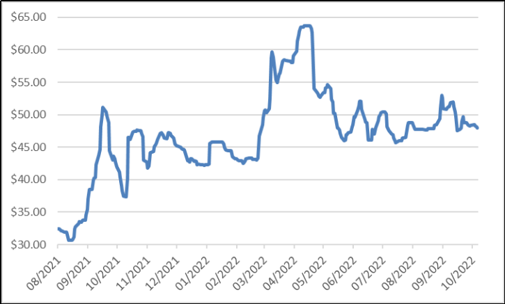 受欧洲能源危机推动,业界开始乐观押注核能未来,铀价已飙升至俄乌冲突以来的最高水平。截至9月,八氧化三铀的价格在1个月内上涨超过7%,自去年春季以来首次站上50美元/磅上方。市场认为,在铀产能提升有限且库存加速耗尽的背景下,供需缺口将越来越大,铀价还存在进一步上升的可能性。