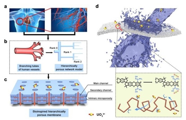 中国科学院理化技术研究所研究员闻利平课题组开发出基于固有微孔聚合物的仿生分级多孔吸附膜。其中逐级递减的孔径结构允许铀酰离子在膜内快速扩散,进而充分利用微孔内丰富的吸附位点。测试表明该分级多孔膜可以将吸附容量提升至原来的20倍。