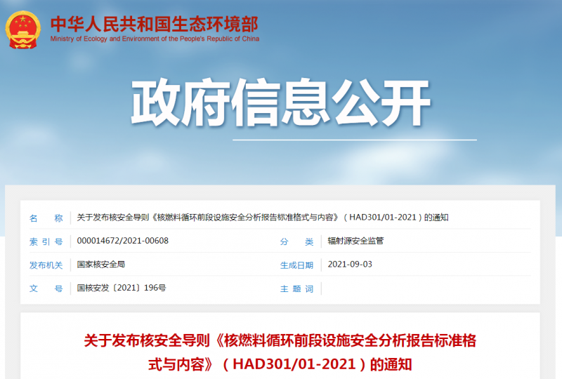为进一步完善我国核与辐射安全法规体系,我局组织修订了核安全导则《铀燃料加工设施安全分析报告的标准格式与内容》(HAD301/01-1991),并将导则名称修改为《核燃料循环前段设施安全分析报告标准格式与内容》(HAD301/01-2021)。现予公布,自公布之日起实施。导则内容可在生态环境部网站(http://www.mee.gov.cn)查询。