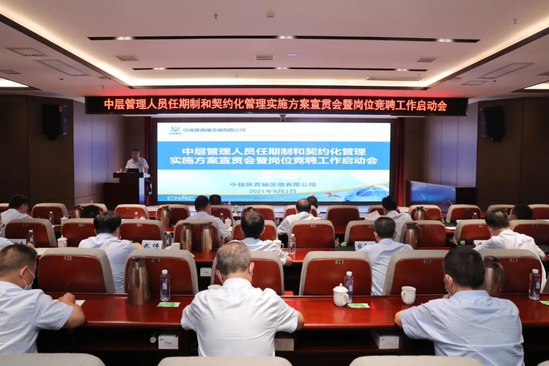 8月3日,中核陕西铀浓缩有限公司组织召开中层管理人员任期制和契约化管理实施方案宣贯会暨岗位竞聘工作启动会,通报了近期组织机构优化情况,对公司中层管理人员任期制和契约化管理实施方案和岗位竞聘方案进行宣贯。