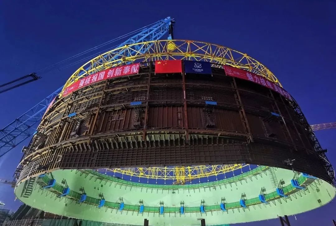 1月16日14时27分,历时7小时,辽宁徐大堡核电3号核岛反应堆厂房外穹顶非能动水箱集成模块顺利吊装就位,标志着“土建钢筋混凝土结构+不锈钢水箱+设备”集成模块化施工技术应用成功。