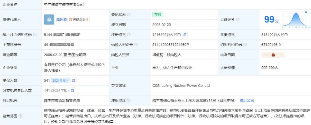 日前,中广核陆丰核电有限公司发生工商变更,注册资本由111.95亿元增至121.65亿元,增幅约9%。中广核陆丰核电有限公司成立于2008年2月,法定代表人为李乐晓,经营范围含核电站及相关设施的投资、建设、经营,生产并销售电力电量及有关附属产品,核电机组备品备件销售及与电力相关技术服务与咨询等。据股东信息显示,该公司由中国广核全资持股。...