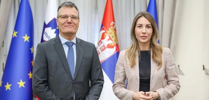 塞尔维亚矿业和能源部长杜布拉夫卡·杰多维奇·汉达诺维奇在塞尔维亚政府大楼会见了斯洛文尼亚大使达姆扬·贝尔甘特,讨论两国在核能领域的潜在合作。