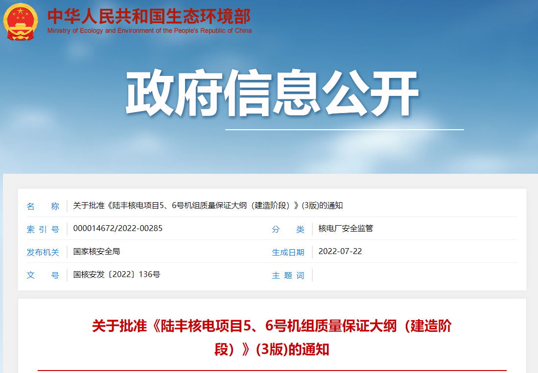 关于批准《陆丰核电项目5、6号机组质量保证大纲(建造阶段)》(3版)的通知