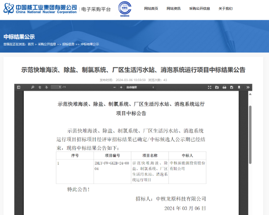3月6日,中核新能源投资股份有限公司成功中标霞浦核电“示范快堆海淡、除盐、制氯系统、厂区生活污水站、消泡系统运行项目”。