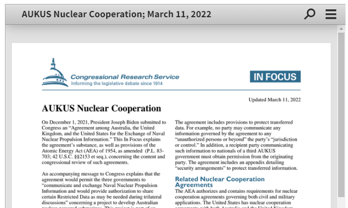 2022年3月11日,美国国会研究服务中心提交了关于美英澳合作开发核潜艇计划的报告。该报告称,2021年12月1日,美国总统拜登向国会提交了一份《澳大利亚、英国和美国关于交换海军核推进信息的协议》。