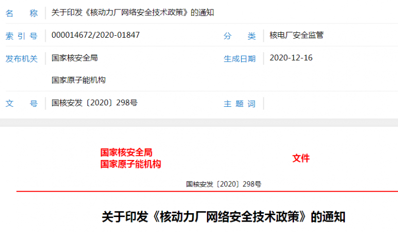 生态环境部发布关于印发《核动力厂网络安全技术政策》的通知