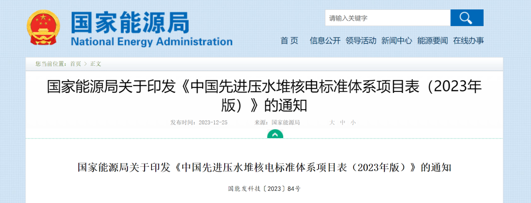 国家能源局发布《中国先进压水堆核电标准体系项目表(2023年版)》