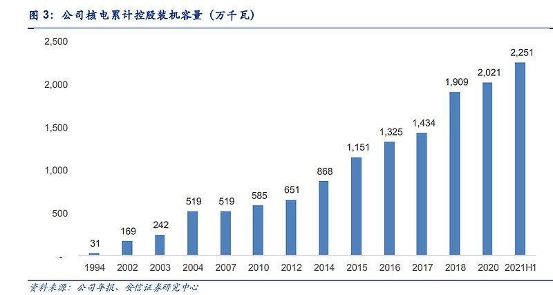截止2021年12月31日,公司控股在建核电机组6台,装机容量624.9万千瓦,包括福清6号机组(预计2022年一季度投运)、漳州1、2号机组(预计分别在2024年和2025年投运)、徐大堡3号、田湾7号和海南小堆(预计在2026年投运);控股核准核电机组2台,包括徐大堡4号和田湾8号,装机容量253.9万千瓦,(预计今年开工,2027年投运)。