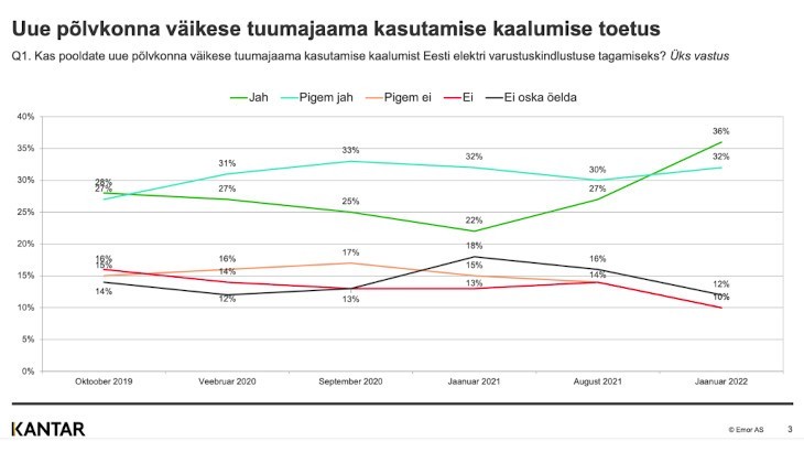 根据 Kantar Emor 为 Fermi Energia 进行的一项民意调查,大约 68% 的爱沙尼亚人支持或倾向于支持考虑在该国建造小型核电站。这高于 2021 年 1 月的 54%。